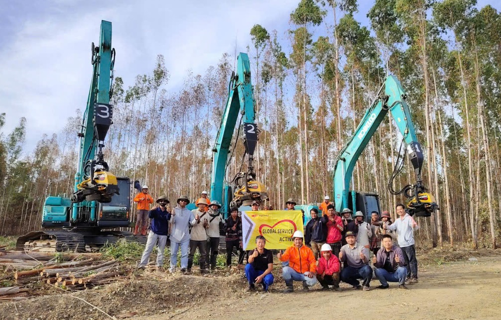 Dàn xe đào Kobelco được trang bị Bộ cắt cây Yuchai tại một rừng cây Bạch đàn